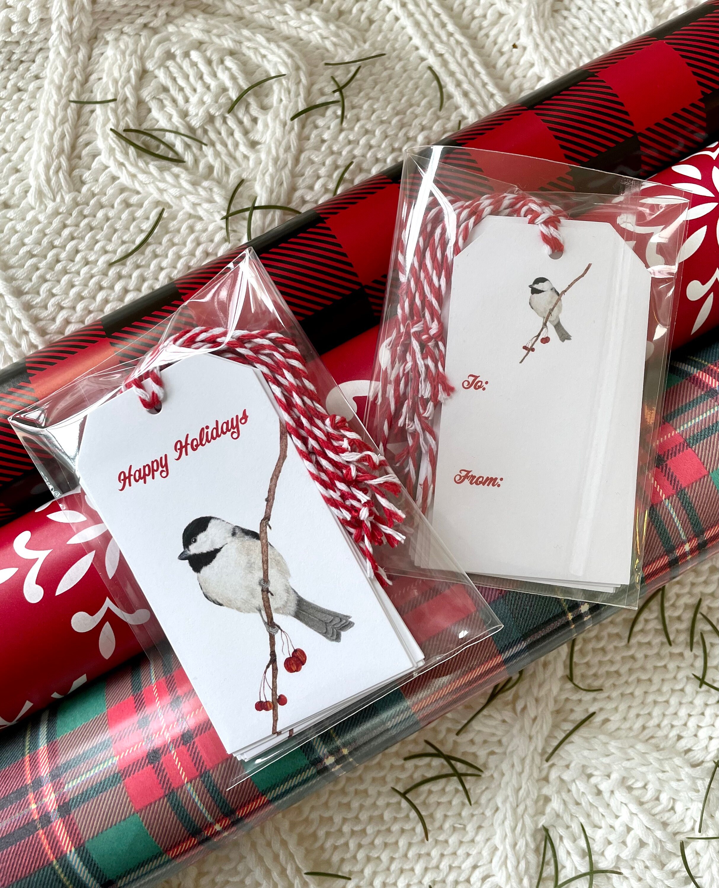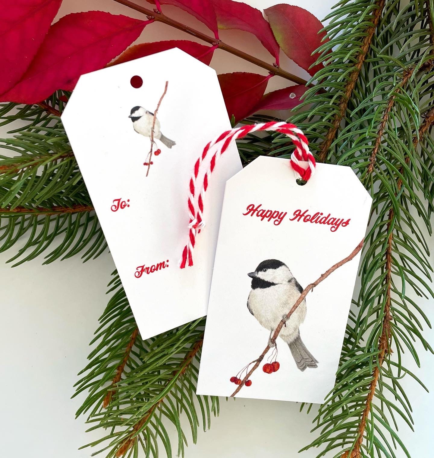 Christmas gift tags. This sweet Chickadee gift tag is a print from one of my original watercolor bird paintings. Add a stylish touch to any of your holiday gifts. Printed on front & back. Made of premium quality paper. Each tag comes with red & white string for hanging & is 2”w x 3 1/2”h. Comes with 10 in a package.