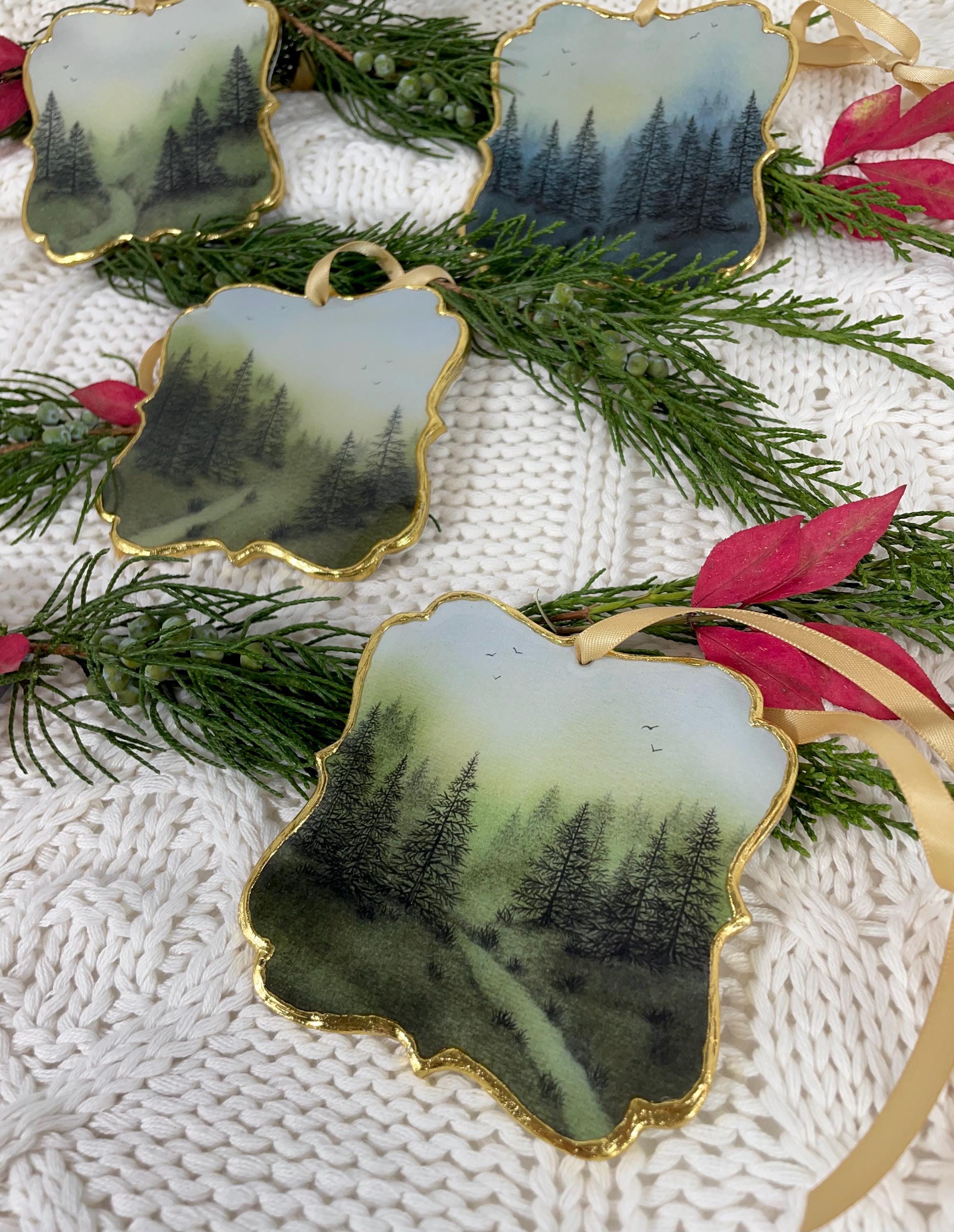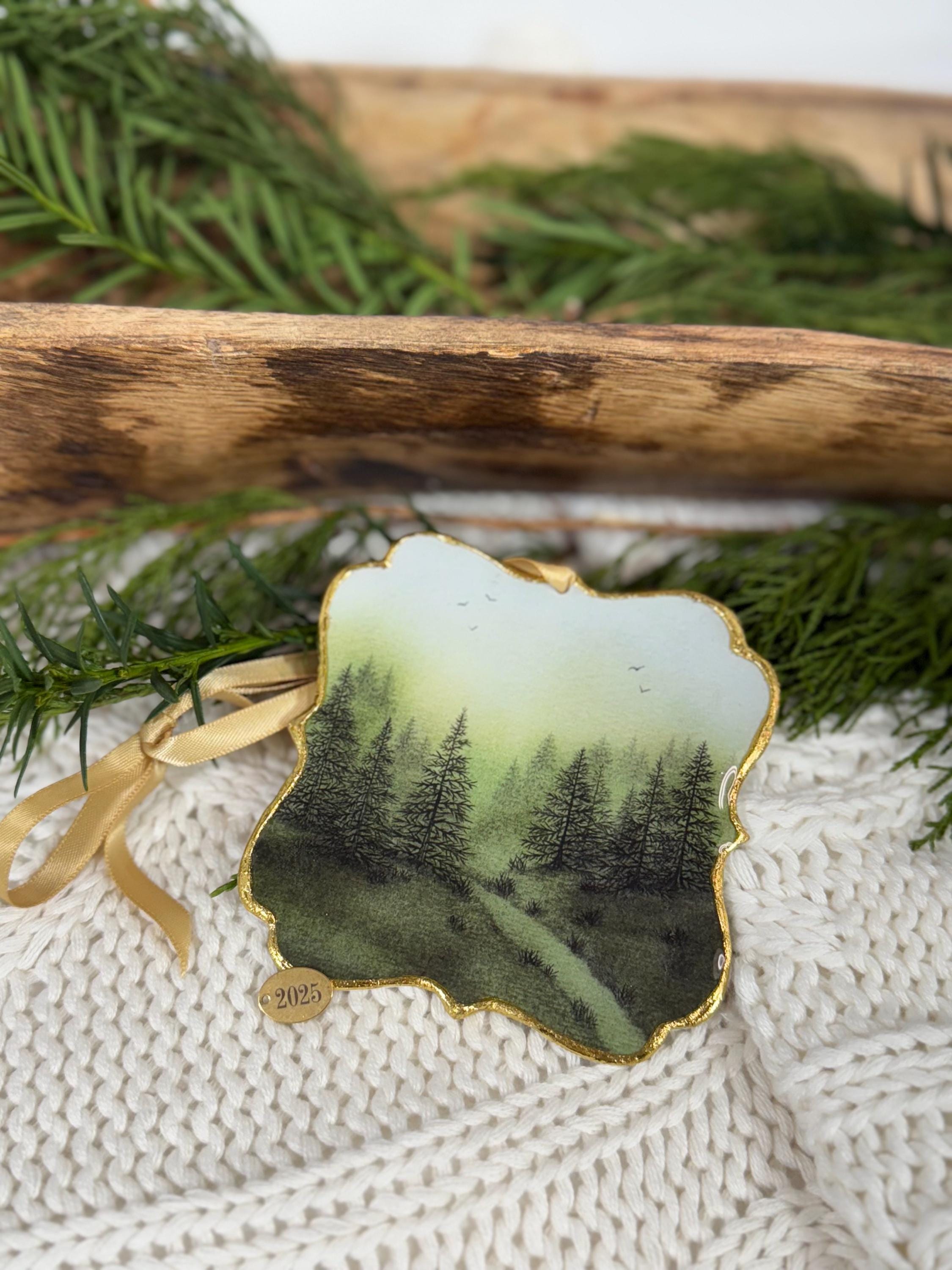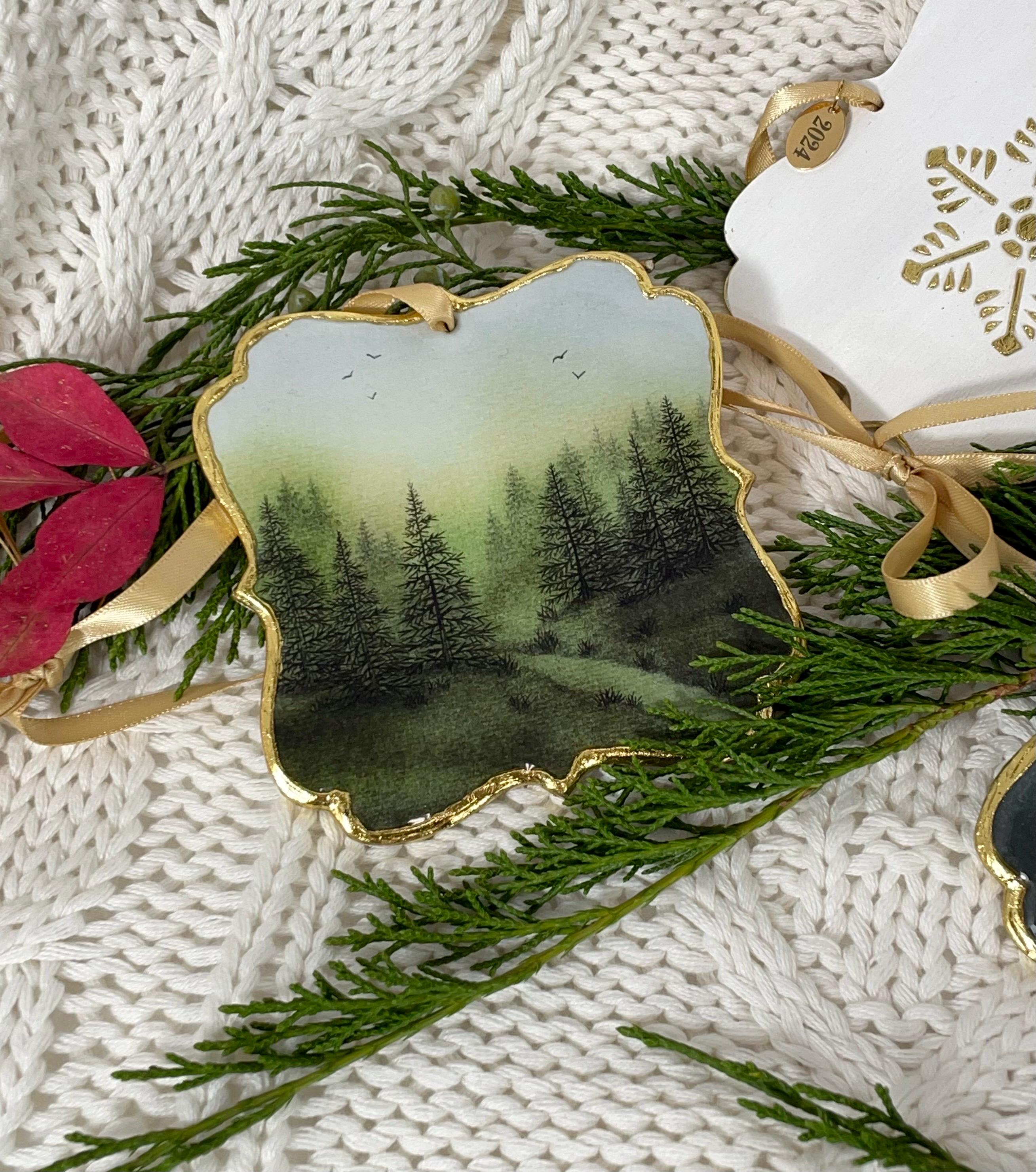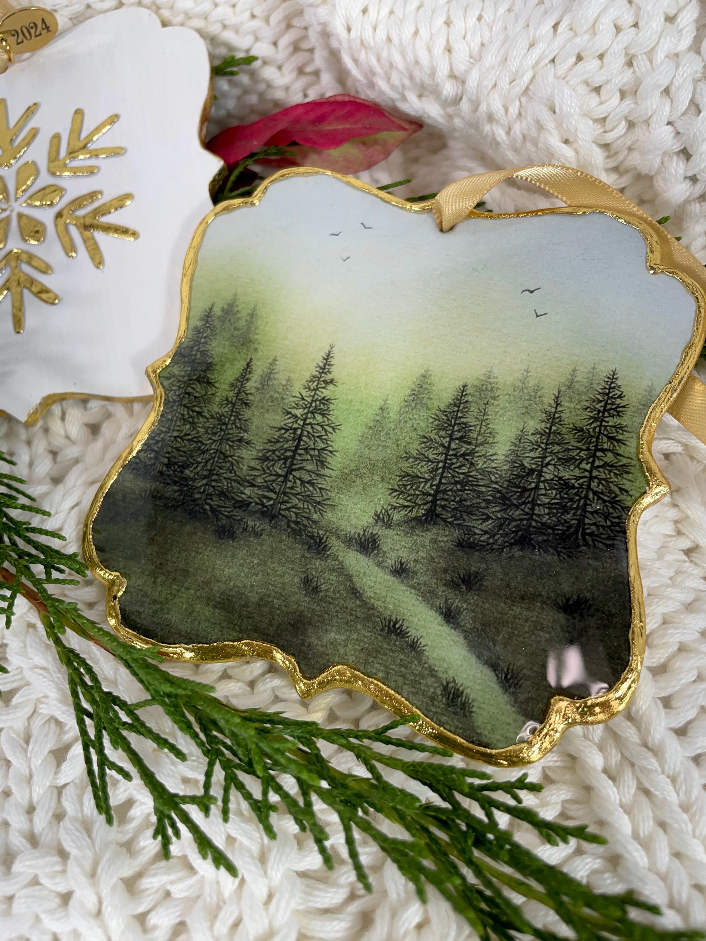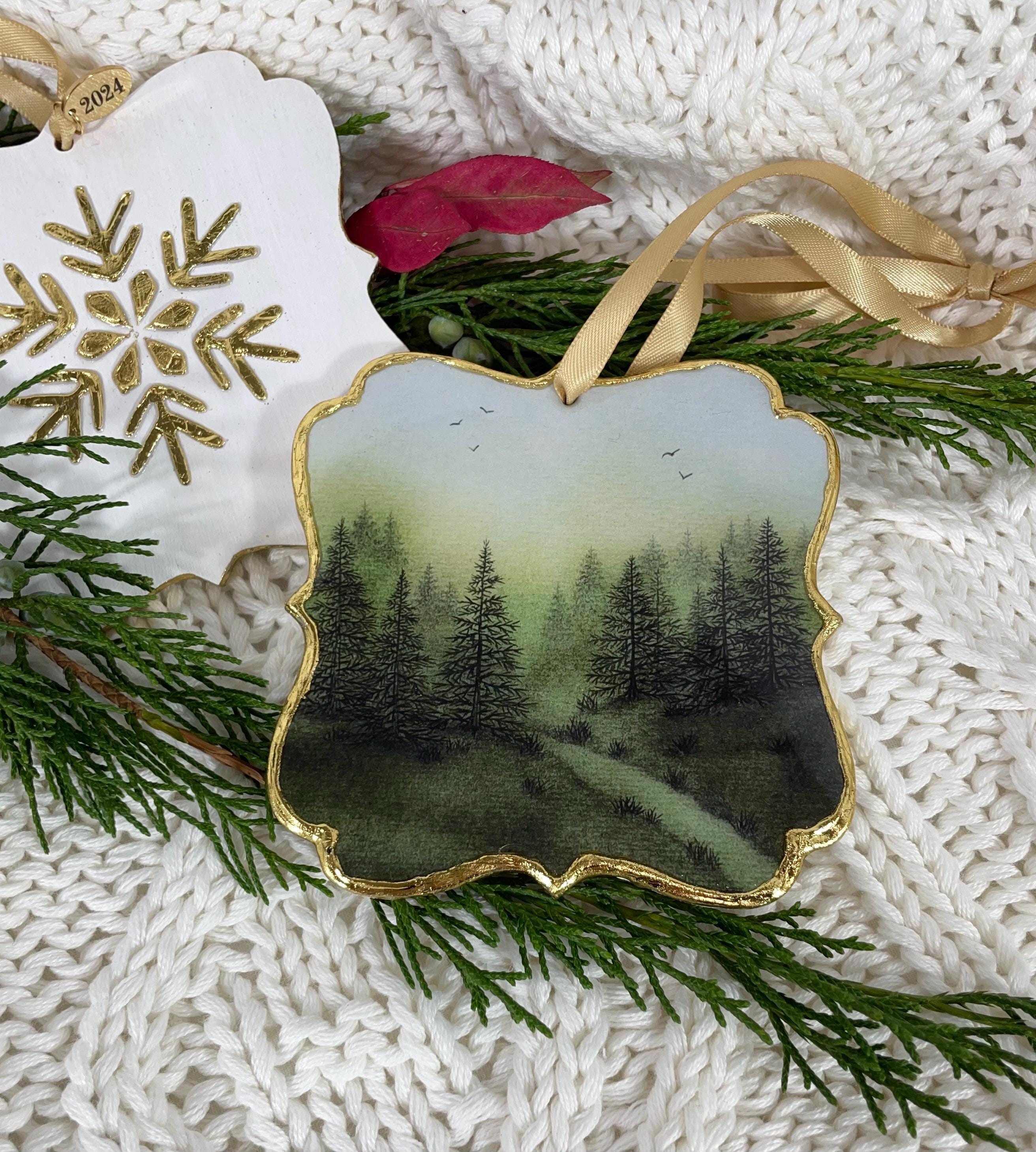A beautiful Northwoods Landscape ornament made from my “Good for the Soul” print. Delicate but rustic all at the same time. Each Ornament has a rustic gold edge & snowflake on back.(**snowflake patterns vary from each ornament) Then topped off with resin for added shine. The ornament will also come with a gold tag engraved with my signature and ‘2025’ to mark the year. Each one is a print from one of my original pieces. This particular ornament print shows off some pretty greens.