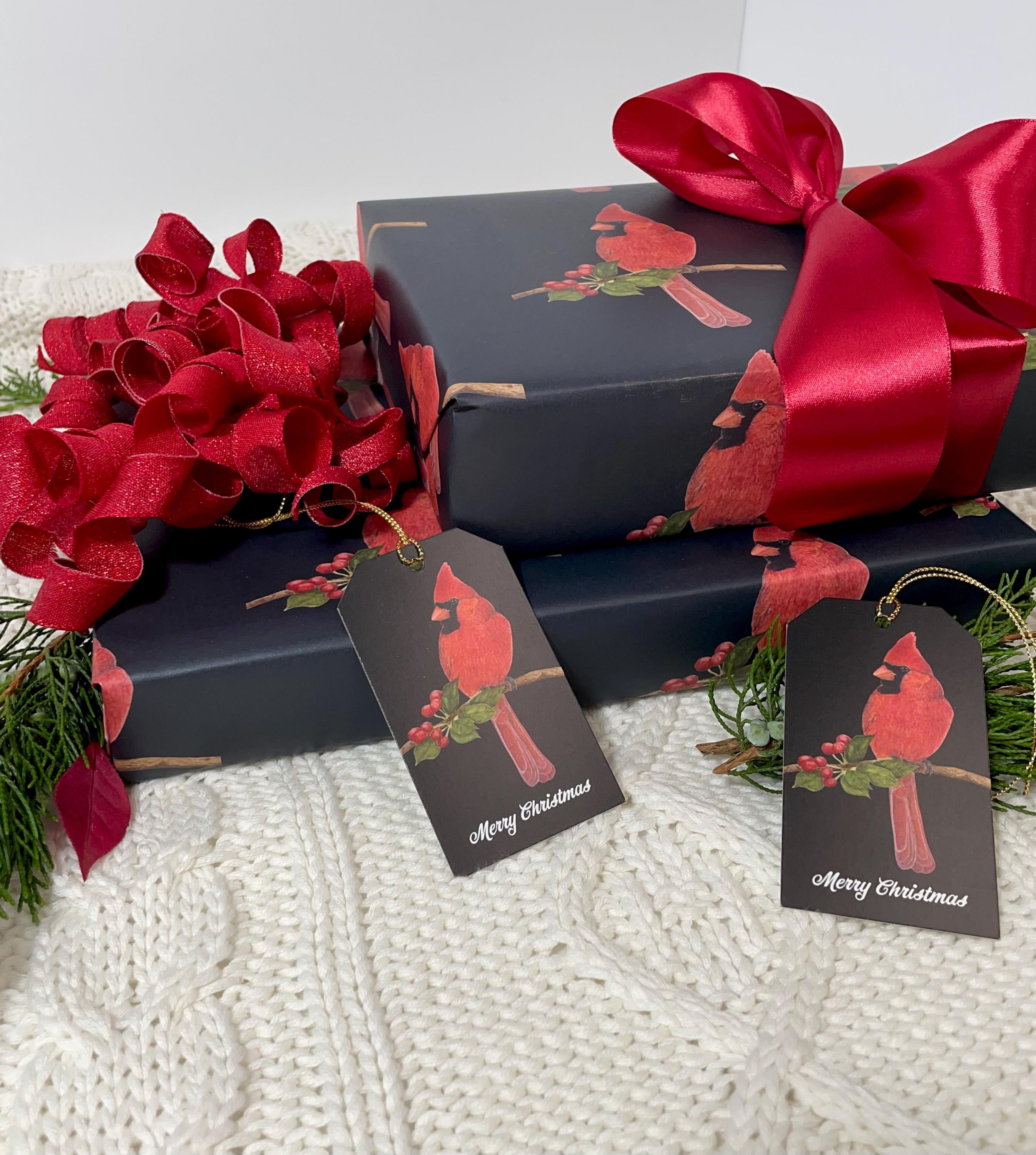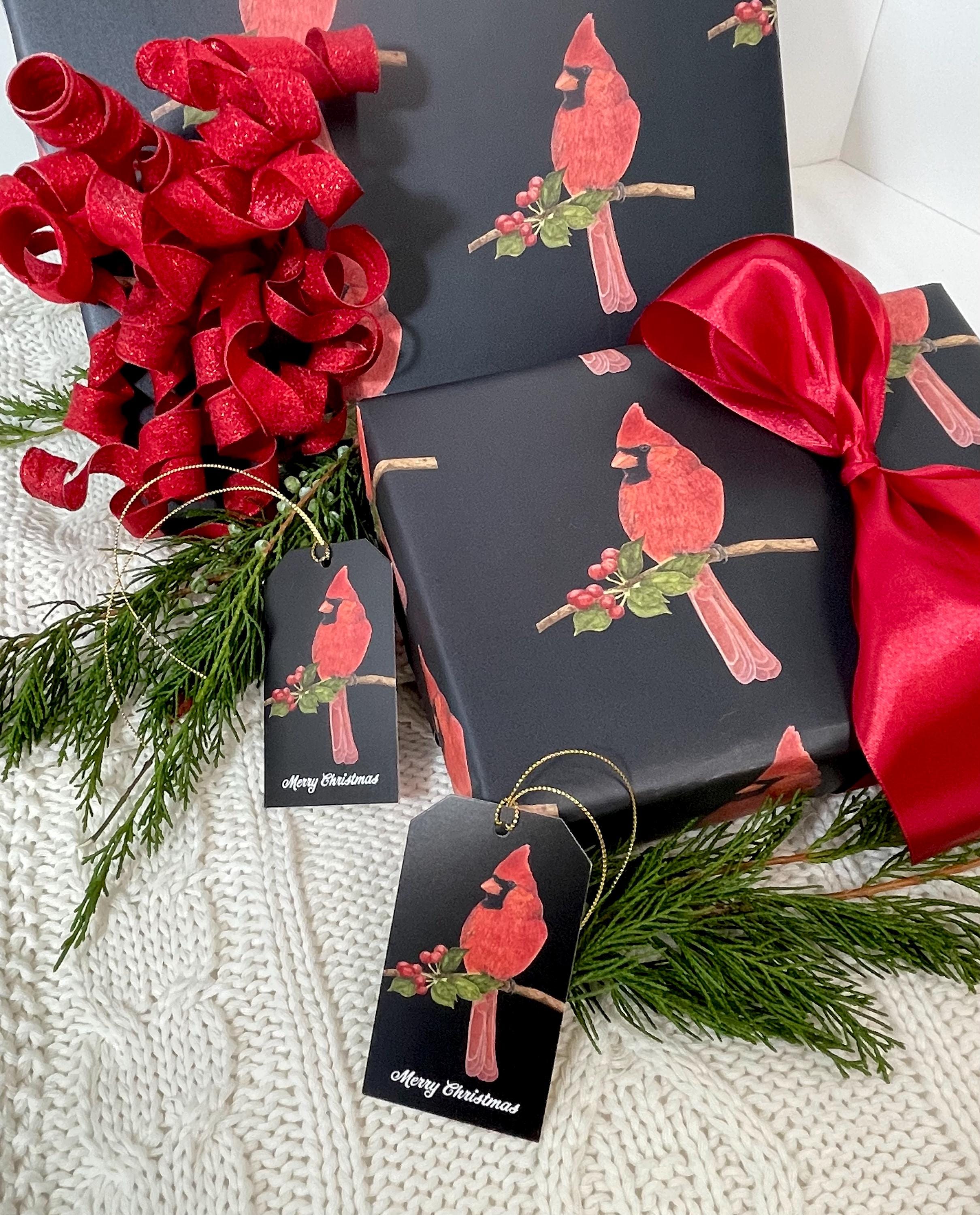 Christmas gift tags. This, black background, Cardinal gift tag is a print from one of my original watercolor bird paintings. Add a stylish touch to any of your holiday gifts. Comes with 10 in a package. Printed on front & back. Made of premium quality paper. Each tag comes with gold string for hanging & is 2”w x 3 1/2”h.