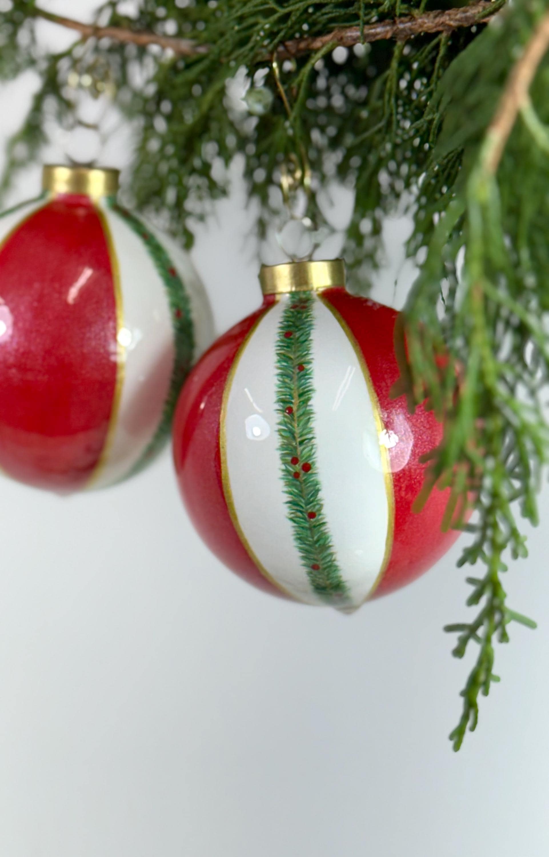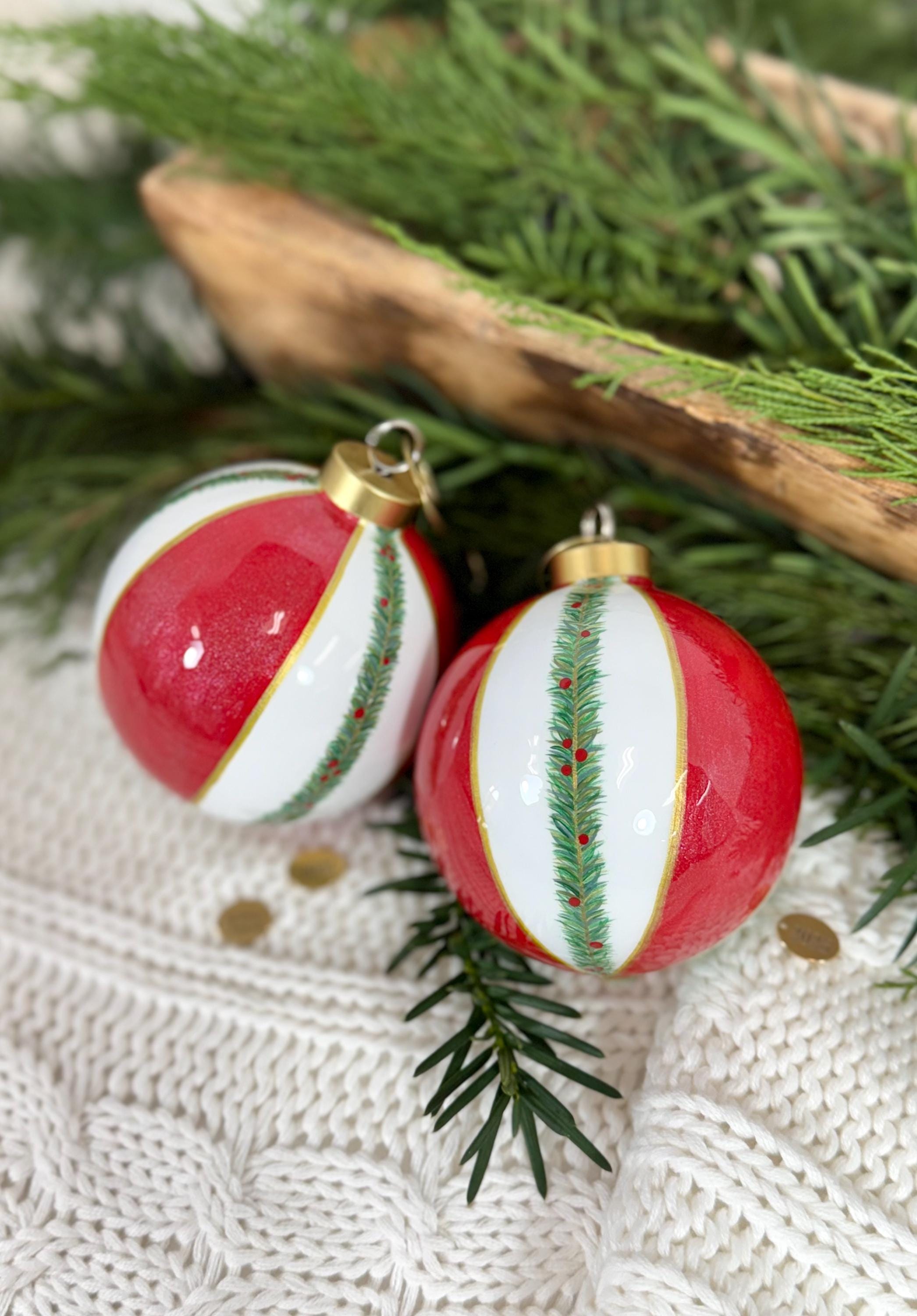 A beautiful hand painted ceramic ornament in a classic round shape. Painted in a festive holiday metallic red and white background with gold dots, embellished with a holiday garland, red berries & accents of gold. Complete with a beautiful coat of shiny resin to add to the holiday sparkle. Each one is topped off with a gold tag engraved with my signature and ‘2025’ to mark the year. No two are alike. Treat yourself or make it the perfect gift.