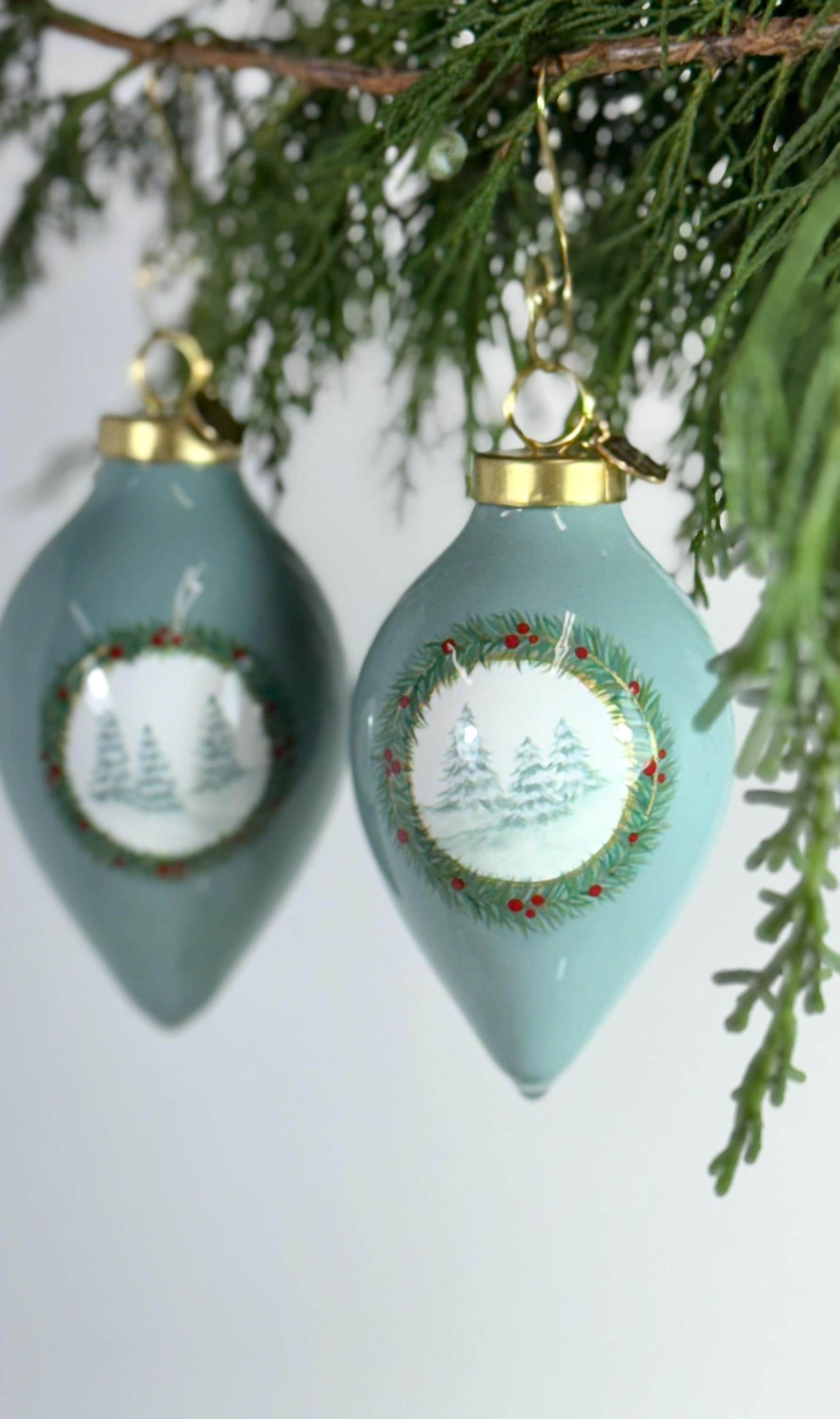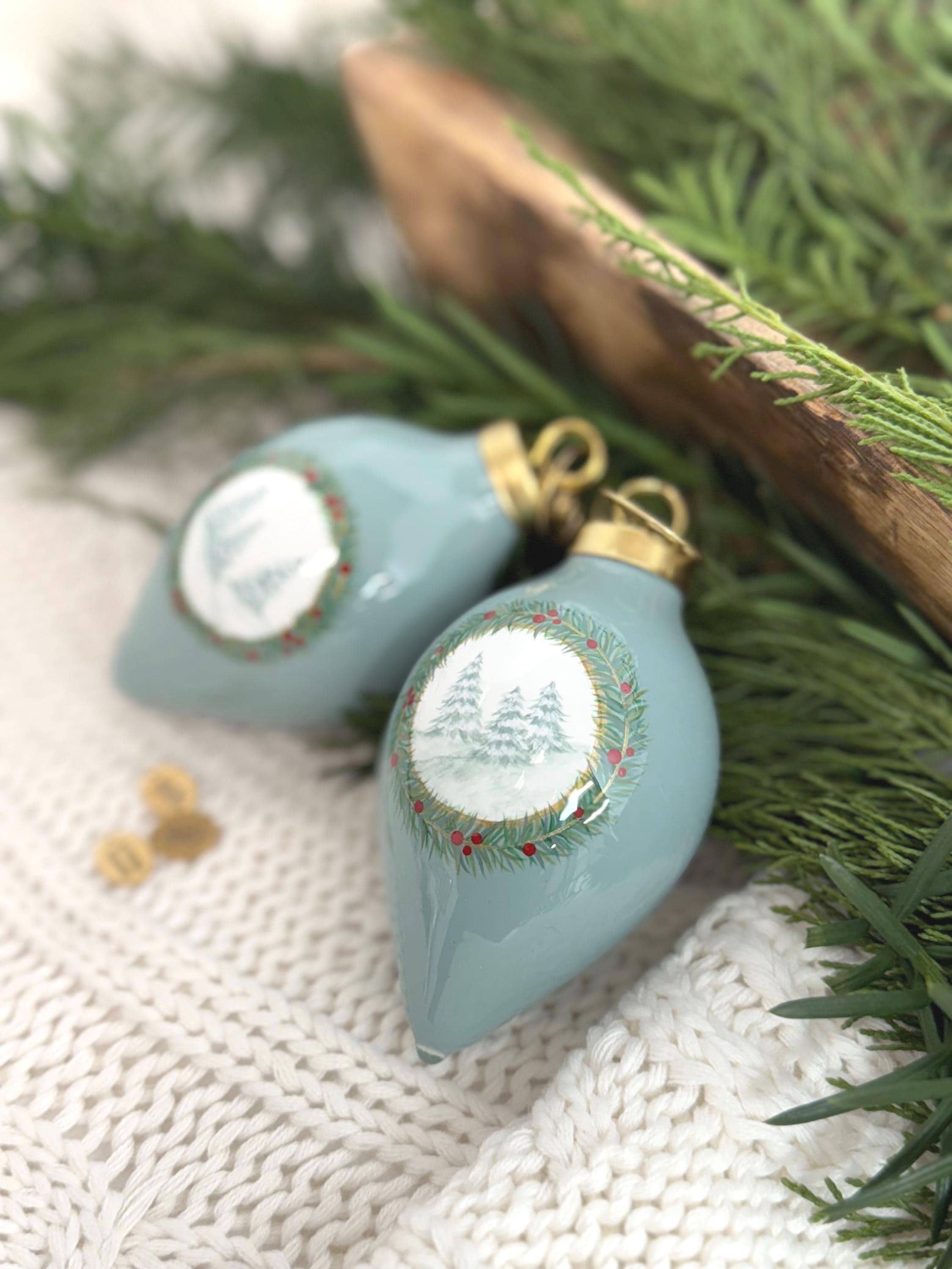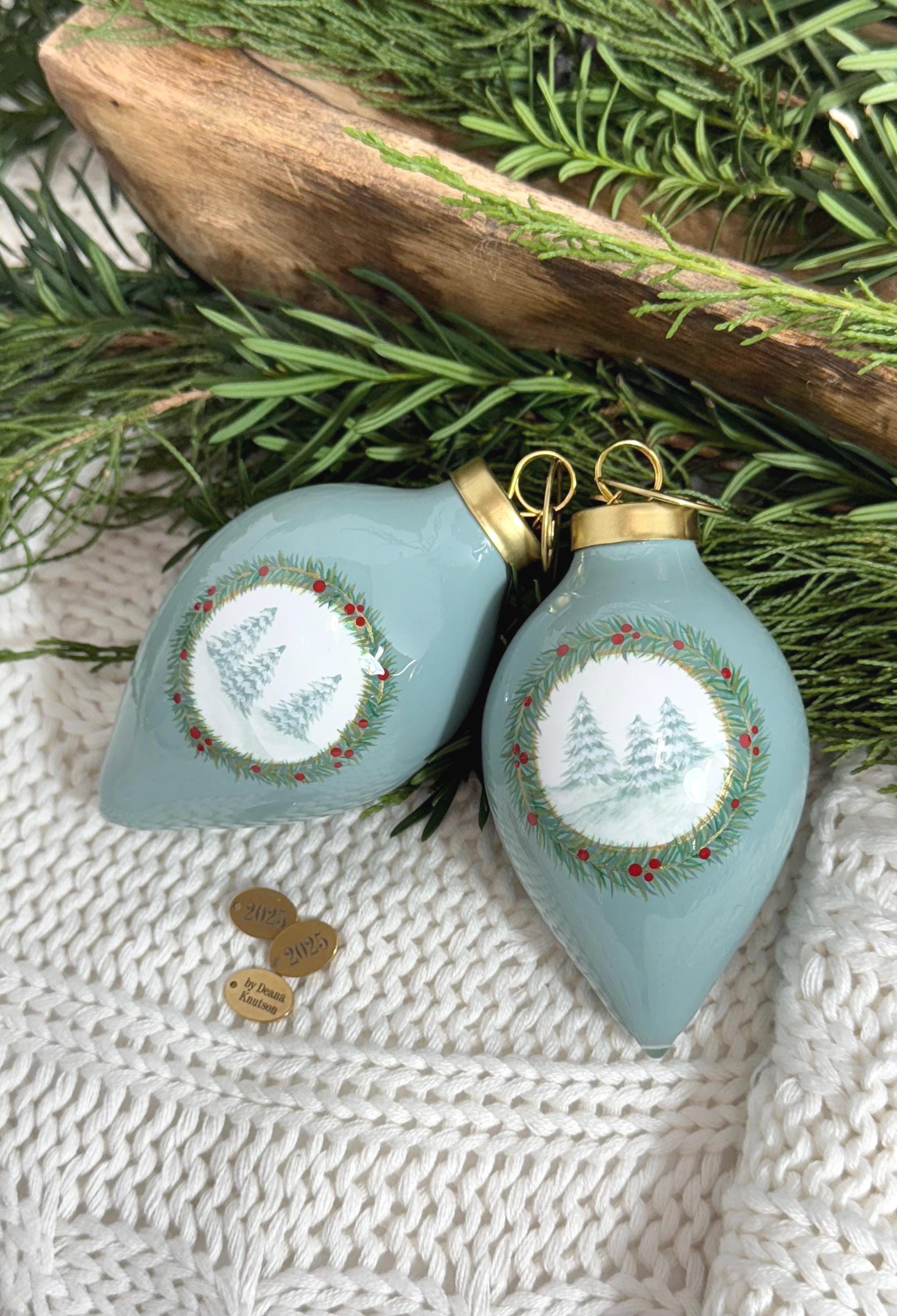 My robins egg blue Winter Trees ornament. A beautiful hand painted ceramic ornament in a classic tear drop shape. Embellished with winter trees, a holiday wreath & accents of gold and red. Complete with a coat of shiny resin to add to the holiday sparkle. Each one is topped off with a gold tag engraved with my signature and ‘2025’ to mark the year. No two are alike. Treat yourself or make it the perfect gift.