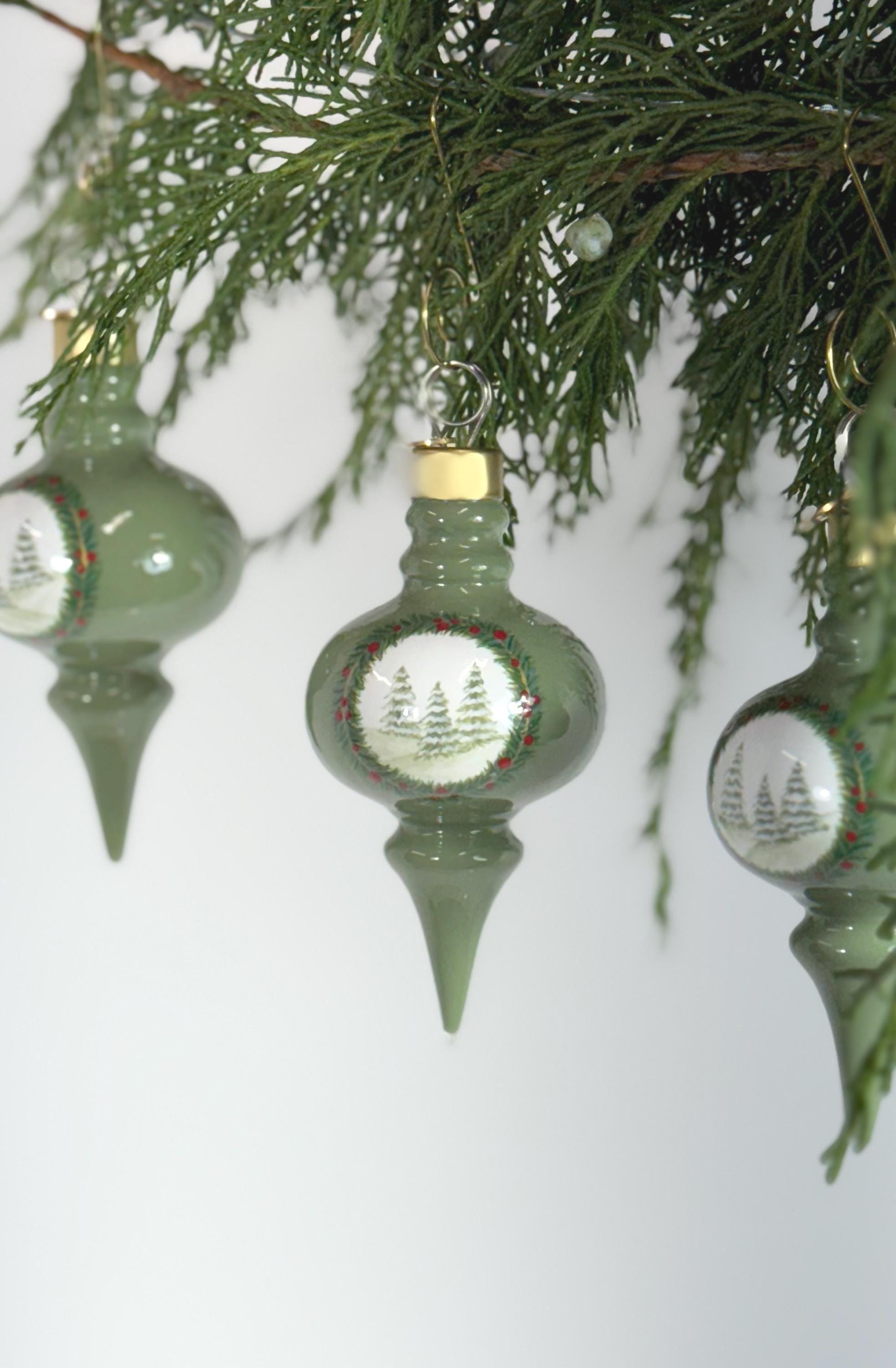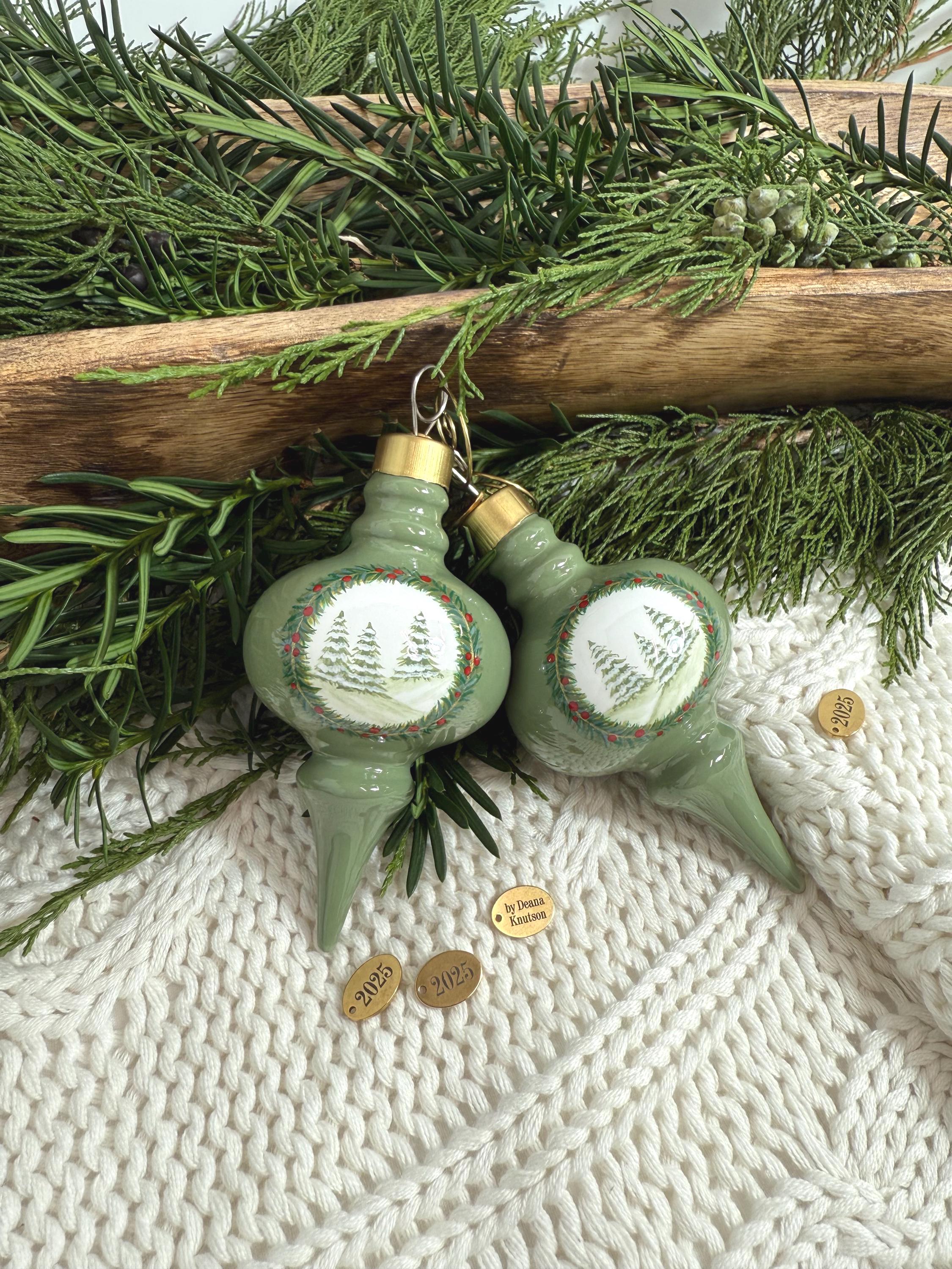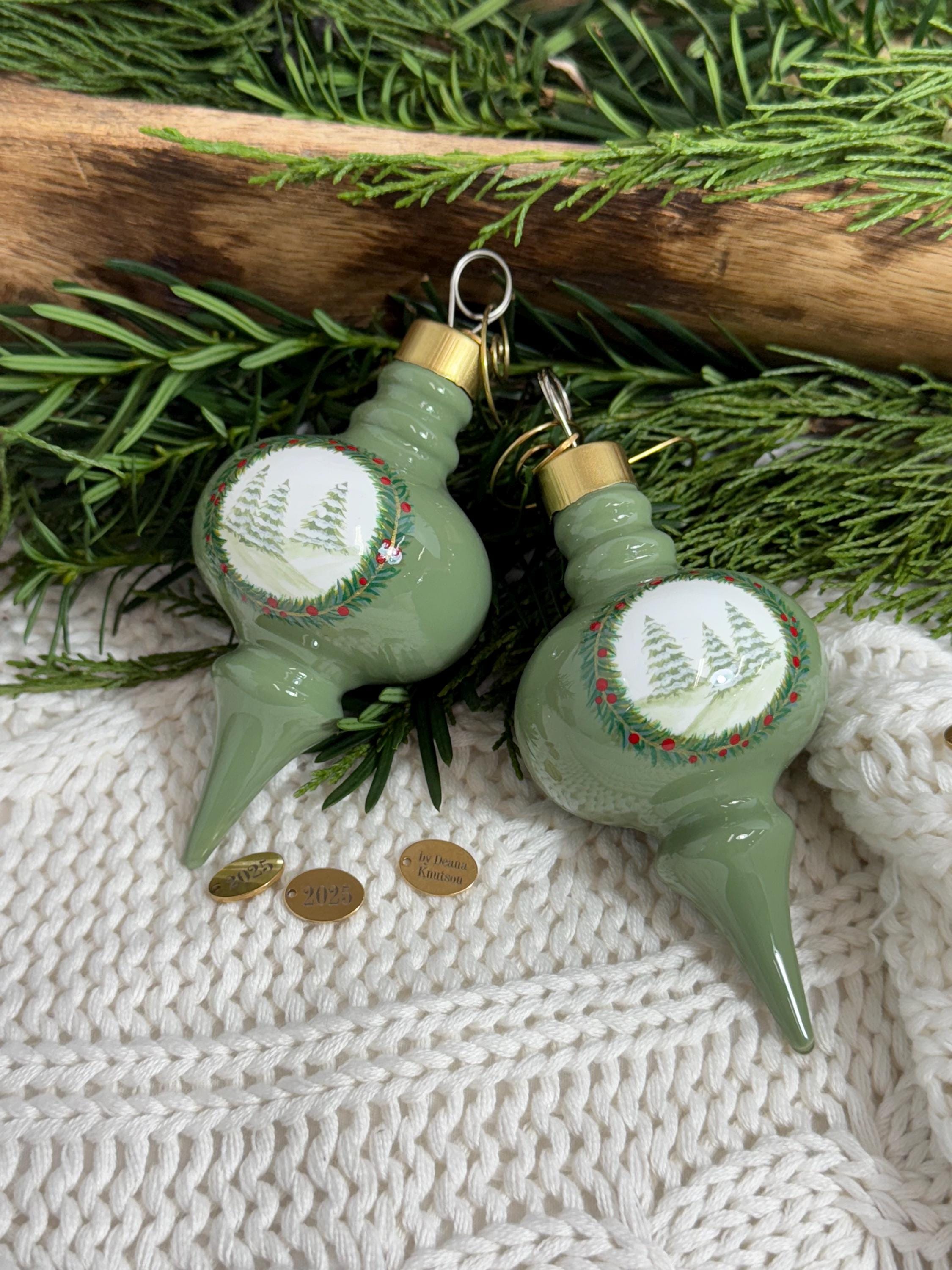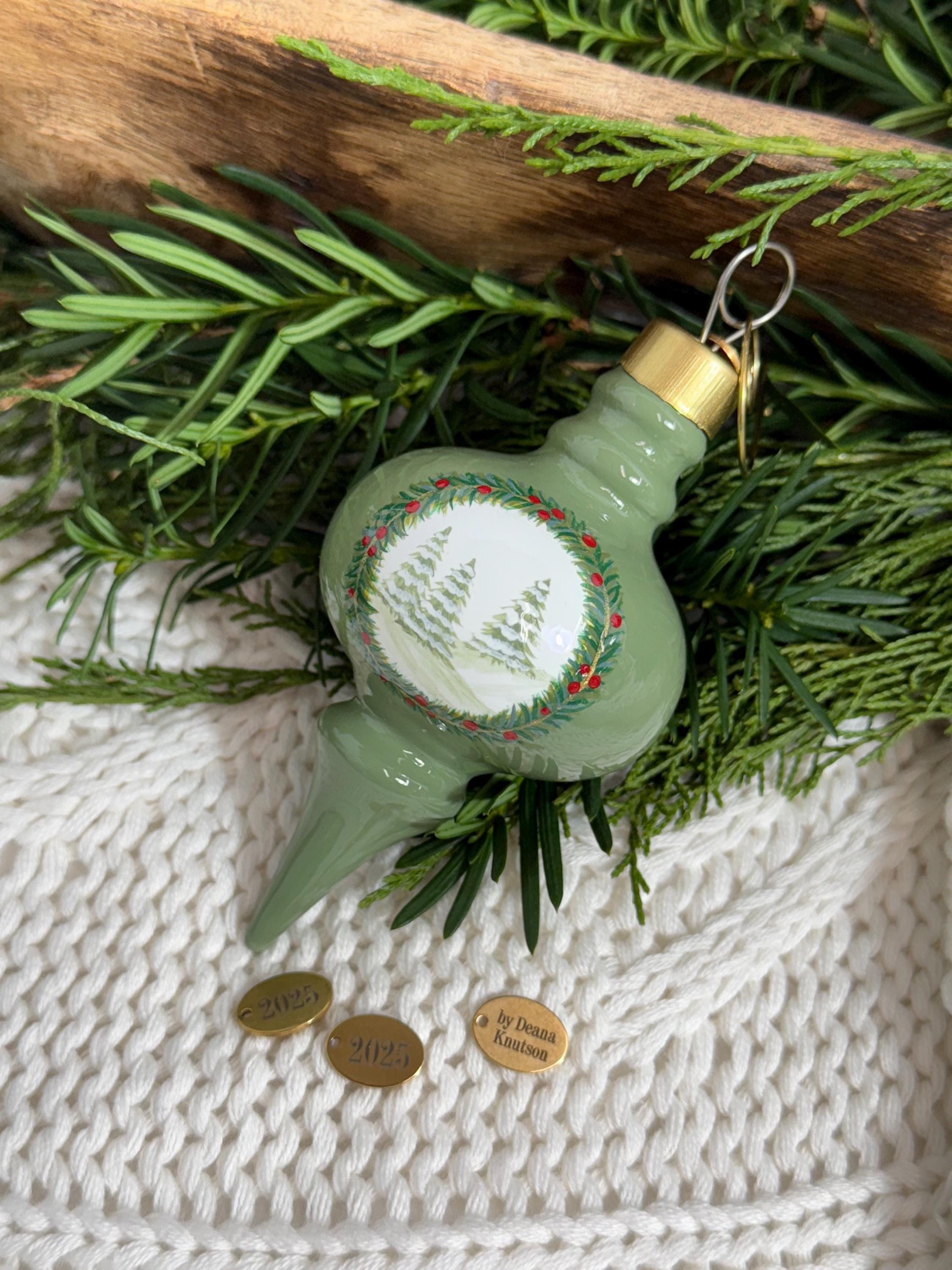 My sage green Winter Trees ornament. A beautiful hand painted ceramic ornament in a classic retro final shape. Embellished with winter trees, a holiday wreath & accents of gold and red. Complete with a coat of shiny resin to add to the holiday sparkle. Each one is topped off with a gold tag engraved with my signature and ‘2025’ to mark the year. No two are alike. Treat yourself or make it the perfect gift.