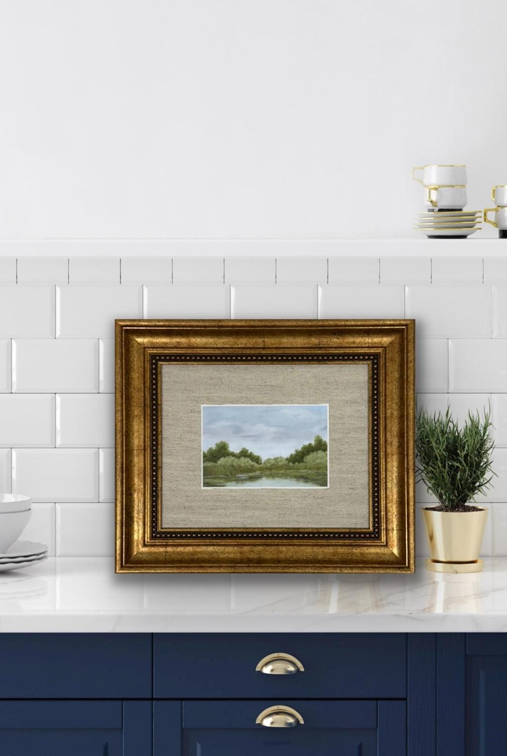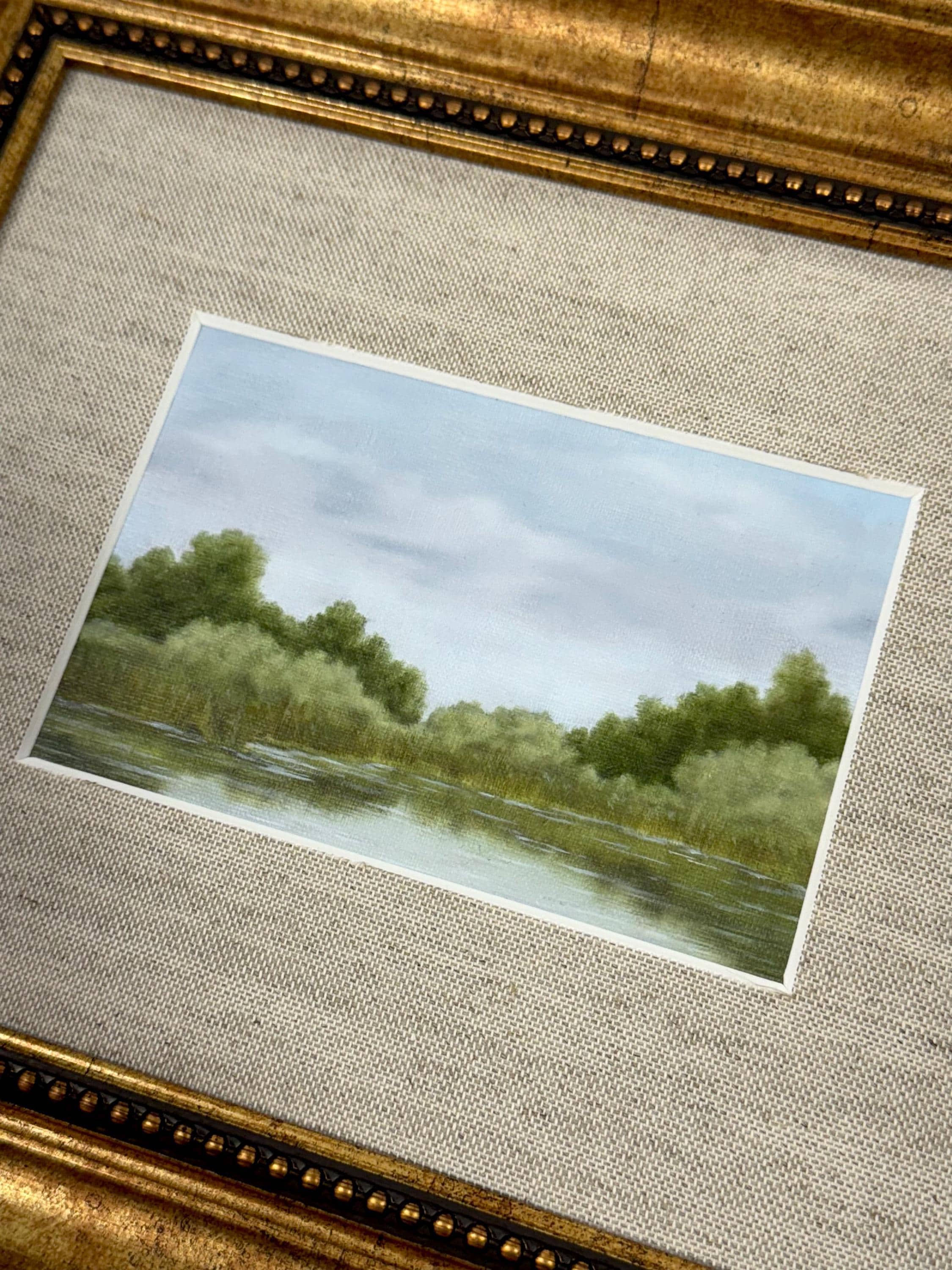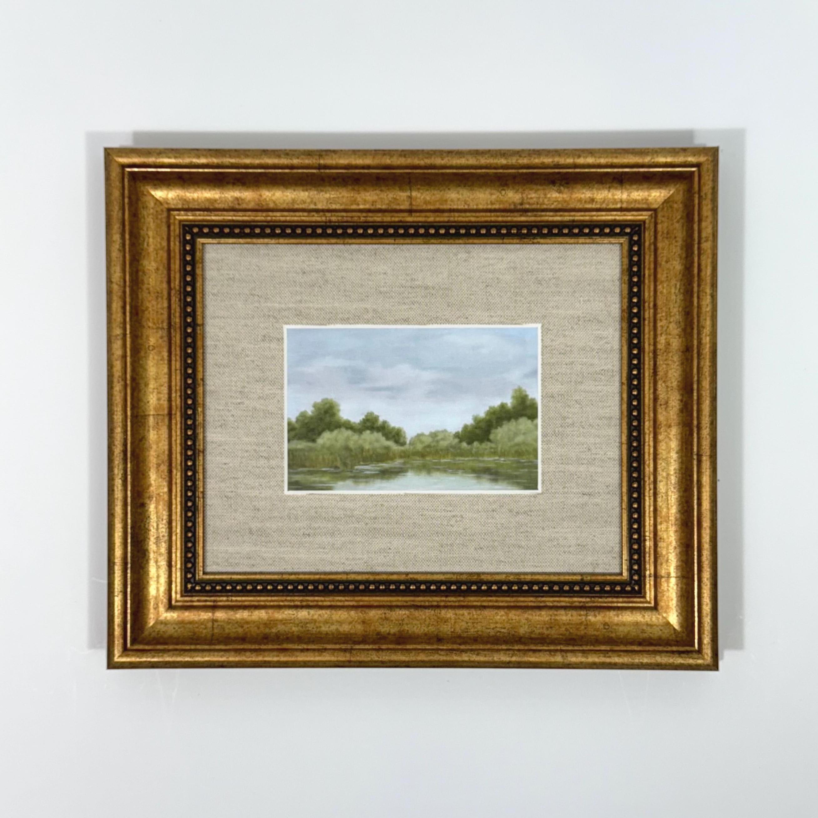 Completed with a linen mat and in an aged gold frame, ready to hang or display on a shelf. Signed & titled on back. Approximate overall frame size 11 1/4” h x 13 1/2” w