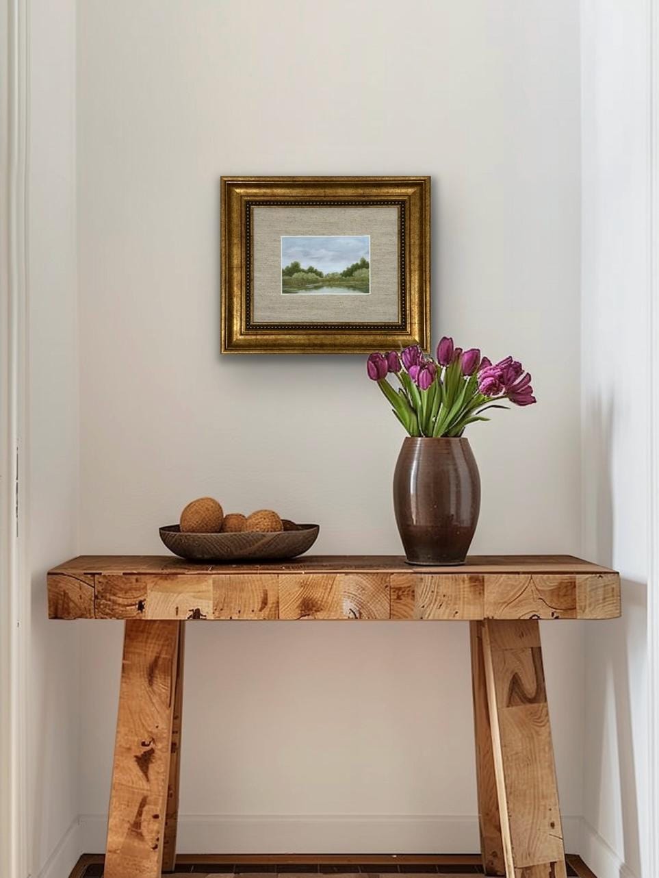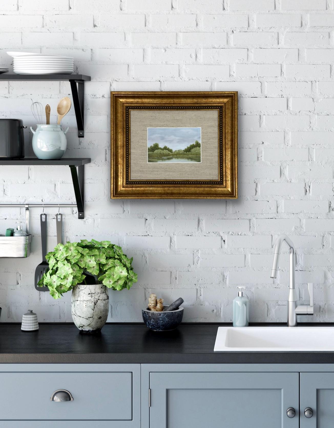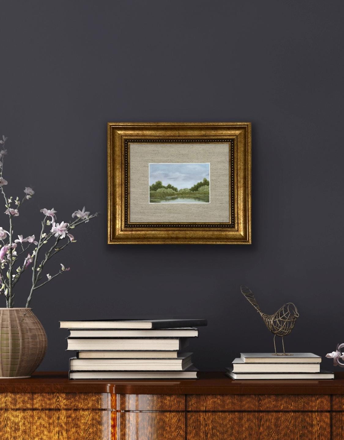 Completed with a linen mat and in an aged gold frame, ready to hang or display on a shelf. Signed & titled on back. Approximate overall frame size 11 1/4” h x 13 1/2” w