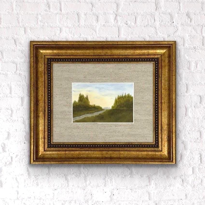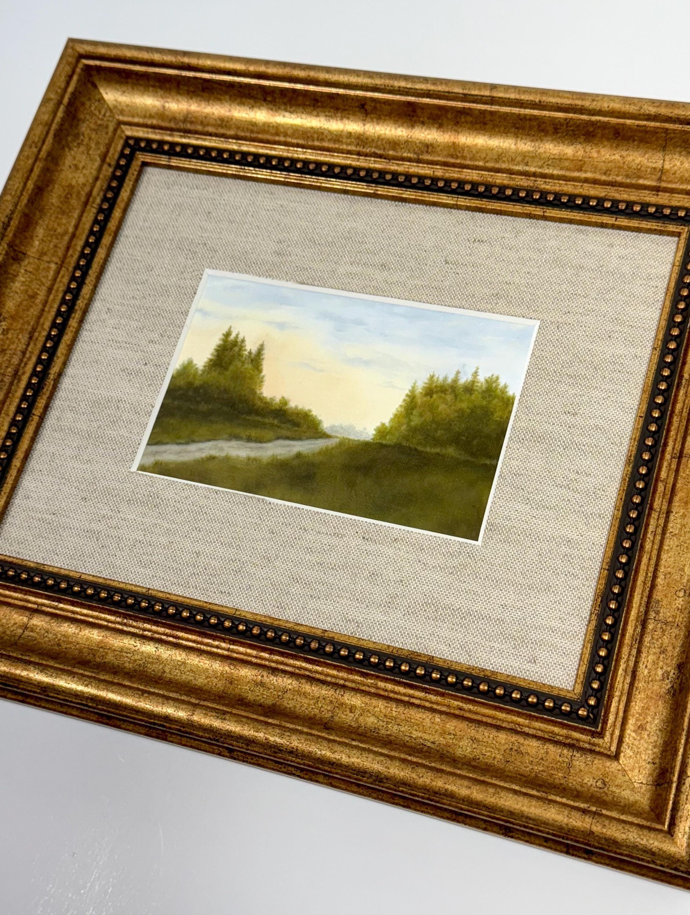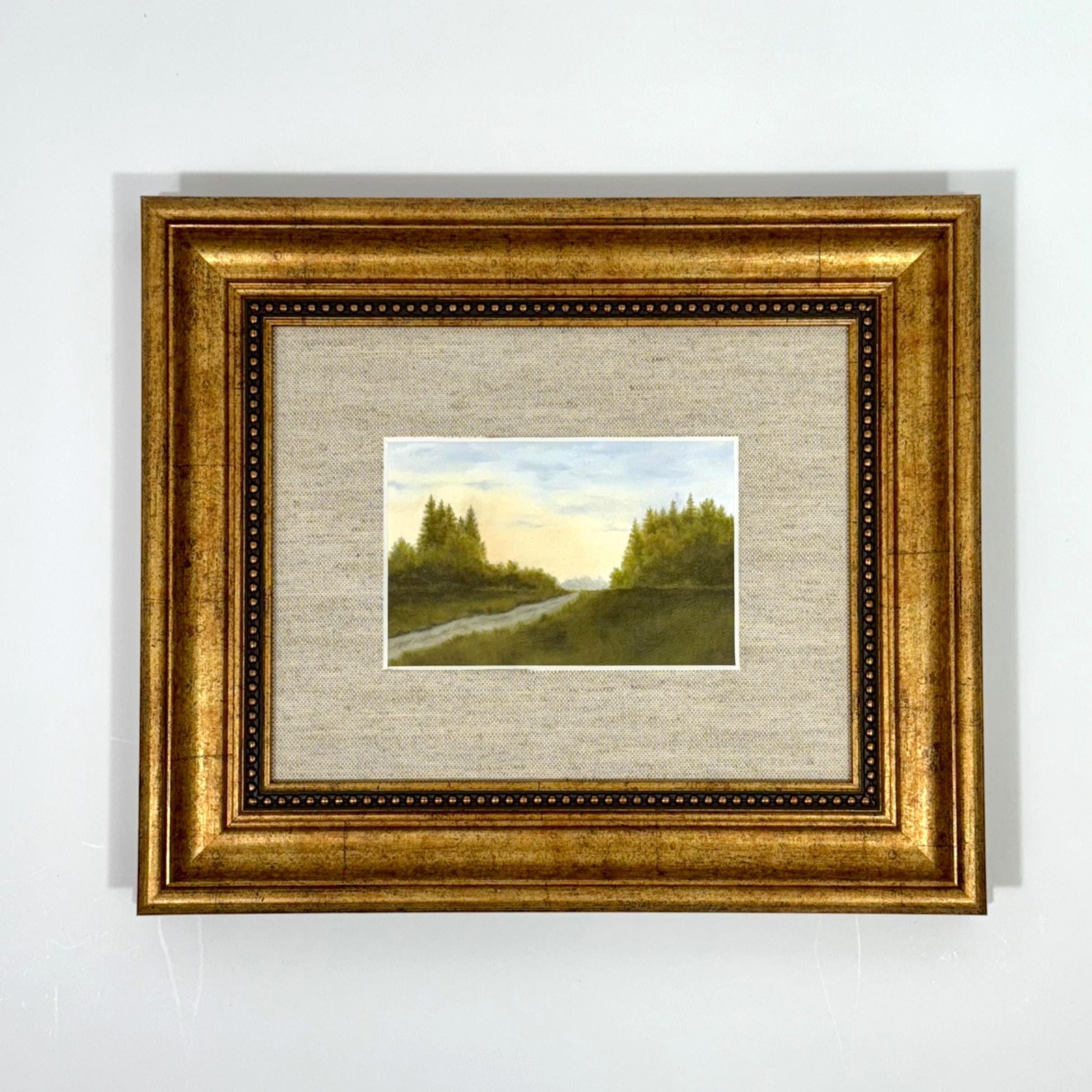“Through the Evergreens” oil painting on linen canvas. A piece of nostalgia on canvas. It’s about a country childhood with adventures down dirt roads, exploring the forest and with all the freedom in the world. Completed with a linen mat, and in an aged gold frame, ready to hang or display on a shelf. Signed and titled on back. Approximate overall frame size 11 1/4”h x 13 1/2”w