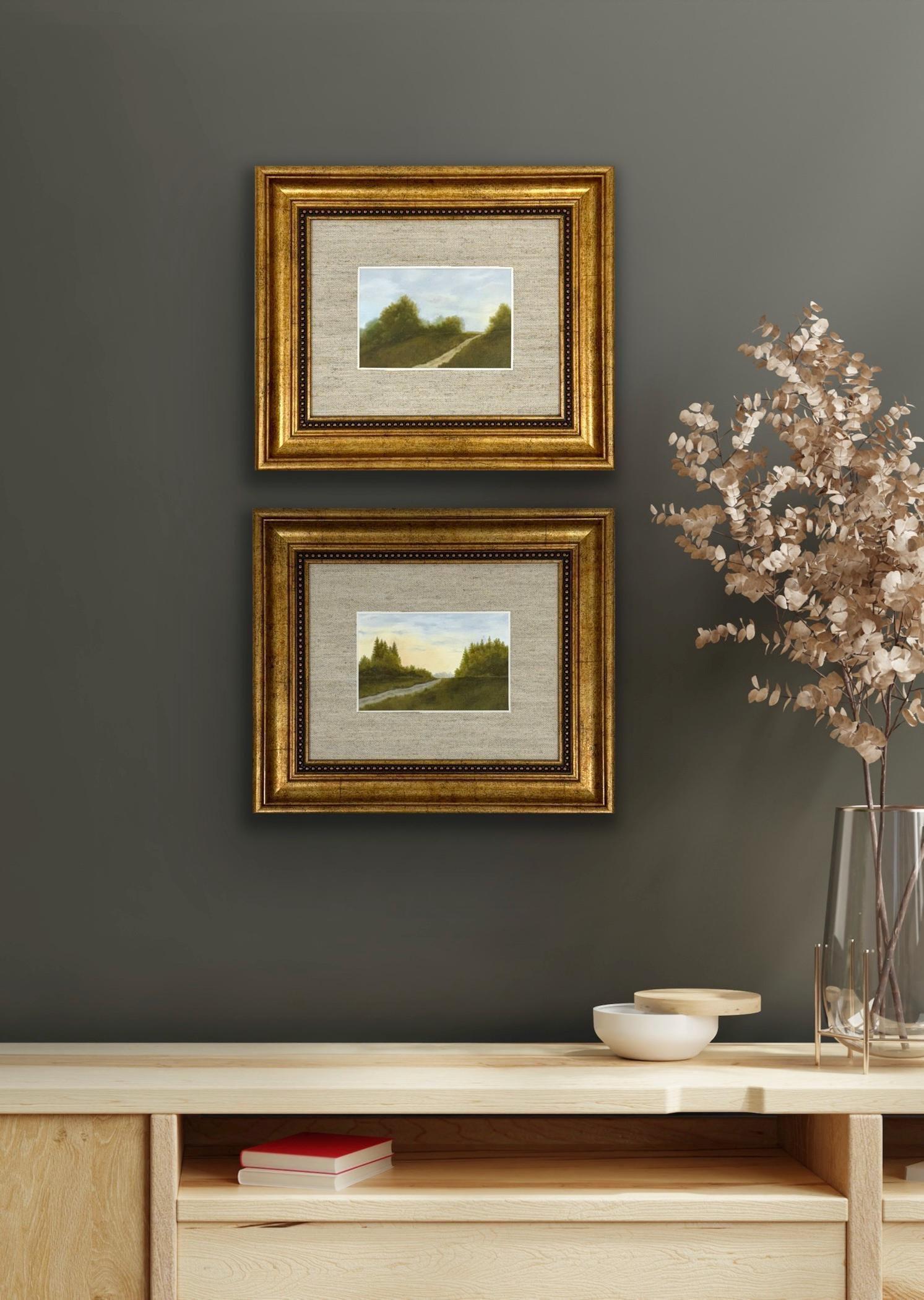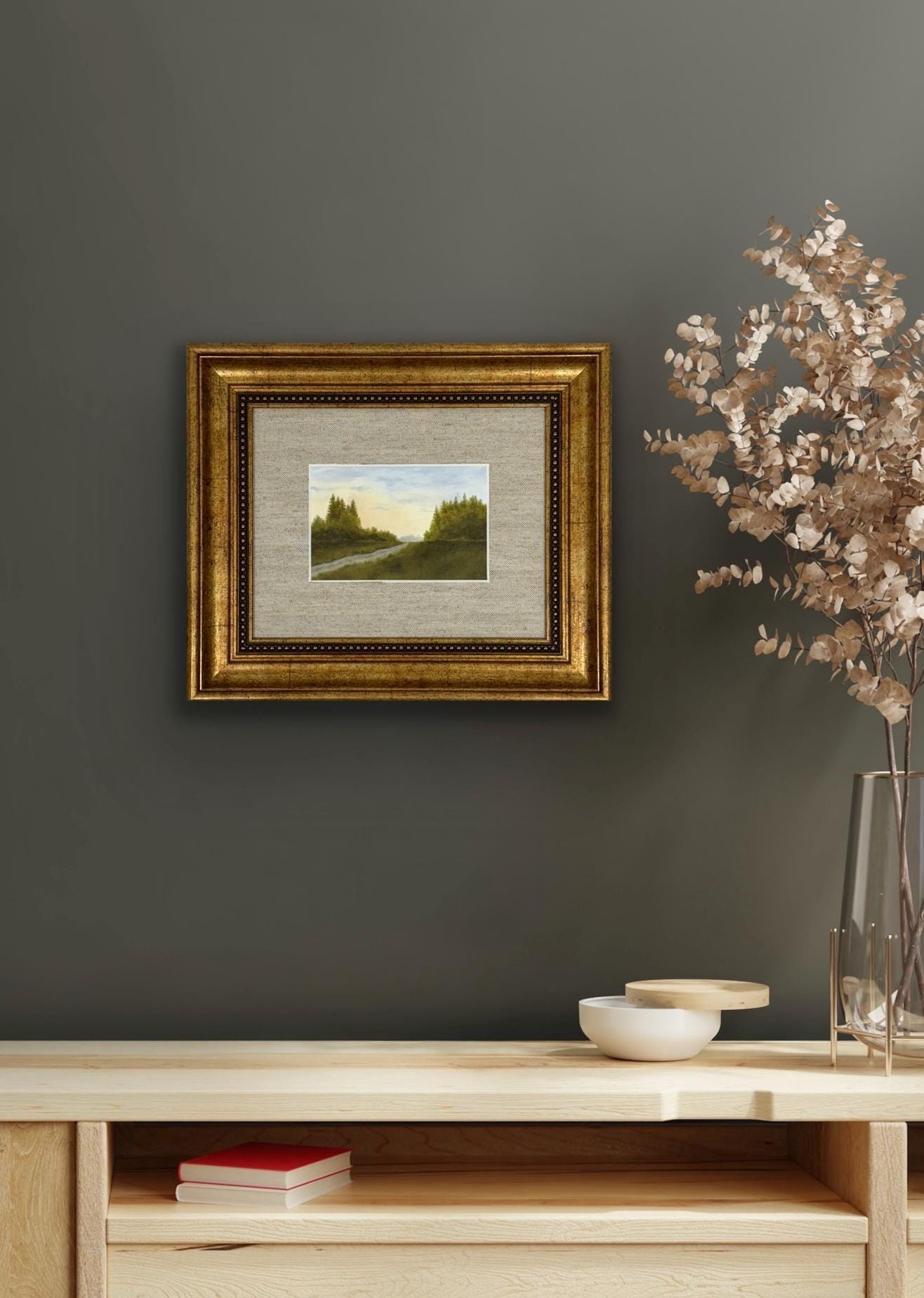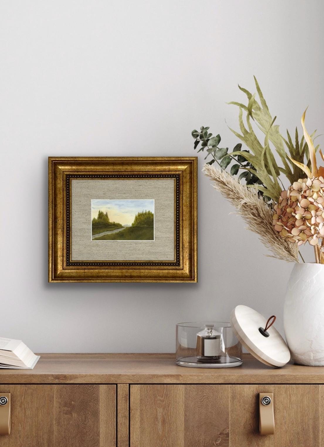 “Through the Evergreens” oil painting on linen canvas. A piece of nostalgia on canvas. It’s about a country childhood with adventures down dirt roads, exploring the forest and with all the freedom in the world. Completed with a linen mat, and in an aged gold frame, ready to hang or display on a shelf. Signed and titled on back. Approximate overall frame size 11 1/4”h x 13 1/2”w